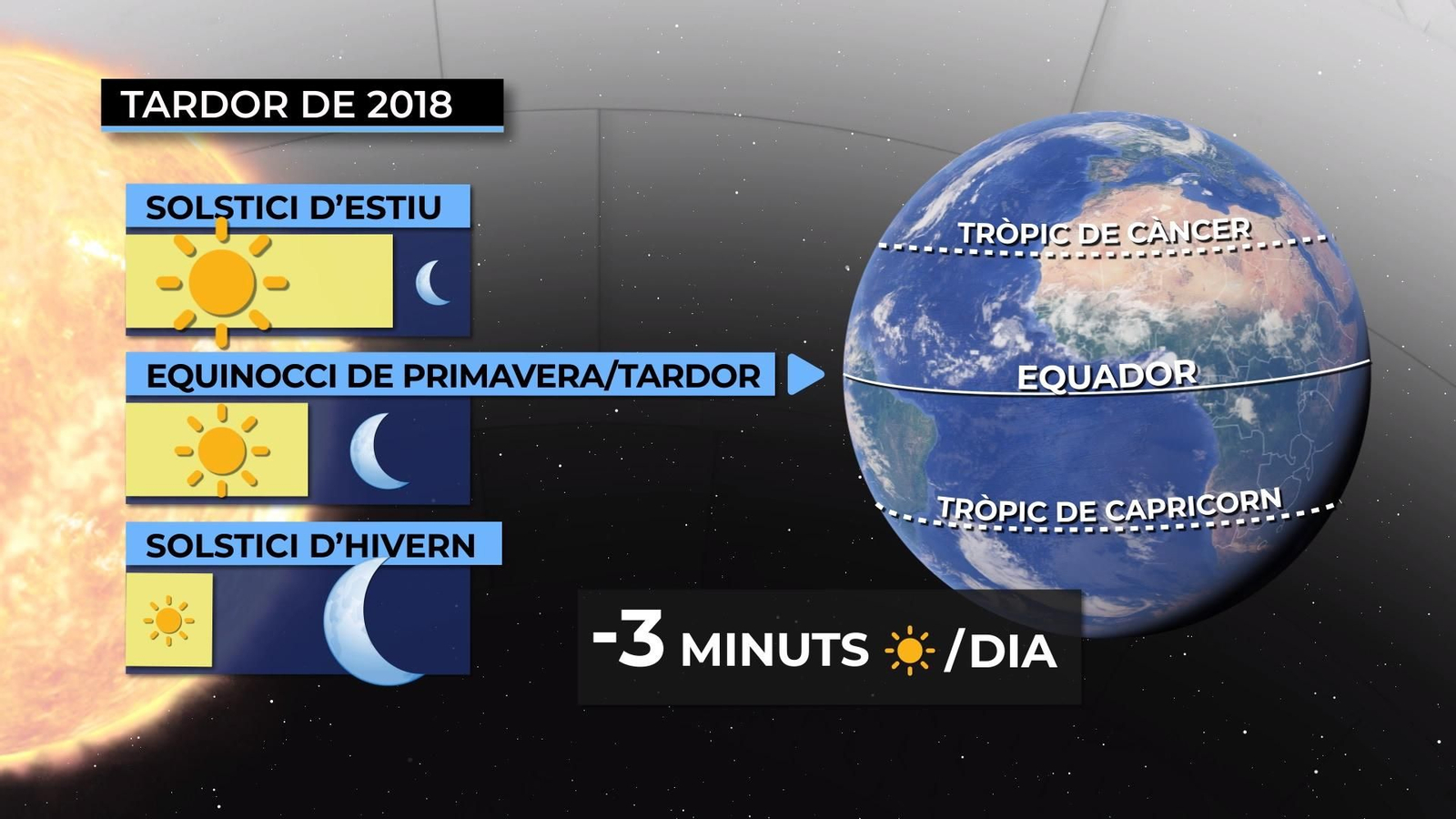 La tardor astronòmica ha arribat la matinada d'aquest diumenge i acabarà el 21 de desembre. L'equinocci de tardor es dona quan el Sol està a l'altura de l'equador, amb la qual cosa el dia i la nit tenen una durada pràcticament idèntica, d'unes dotze hores. No hem de confondre l'equinocci amb l'equilux, quan el dia i la nit duren exactament el mateix, i es produirà el dimecres 26 de setembre. De mitjana, cada dia durant la tardor perdrem fins a tres minuts de llum fins arribar al solstici d'hivern, el pròxim 21 de desembre, el dia més curt de l'any.