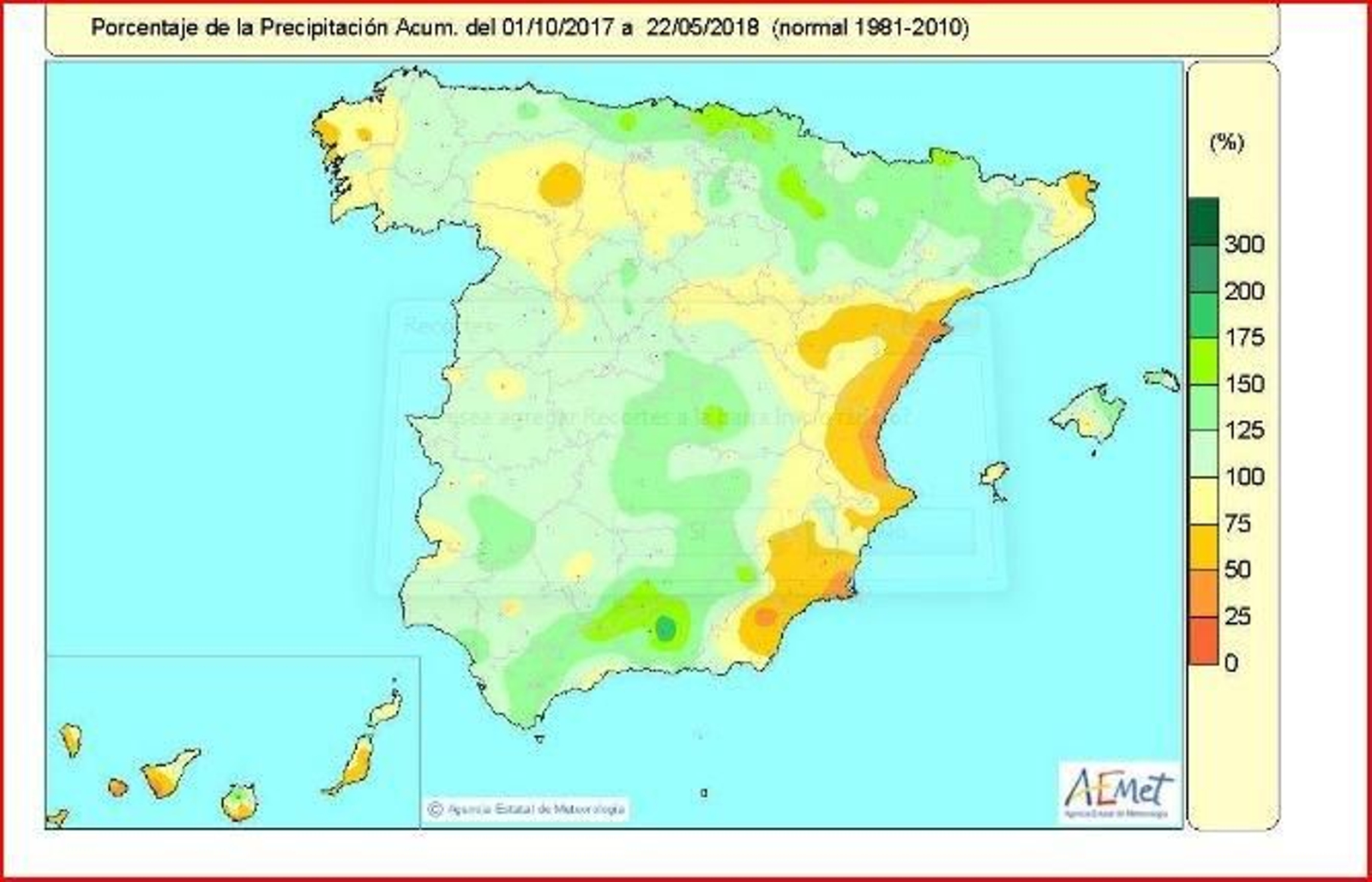 Percentatge de la preciptació acumulada de l'1/10/2017 al 22/05/2018 / Aemet.es