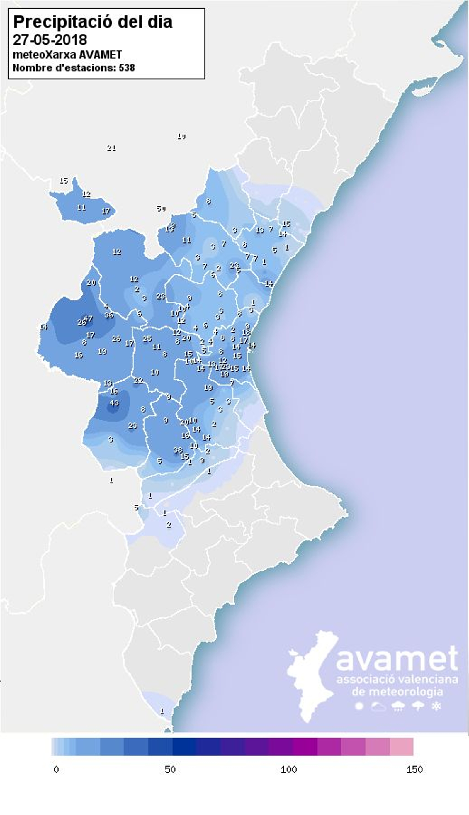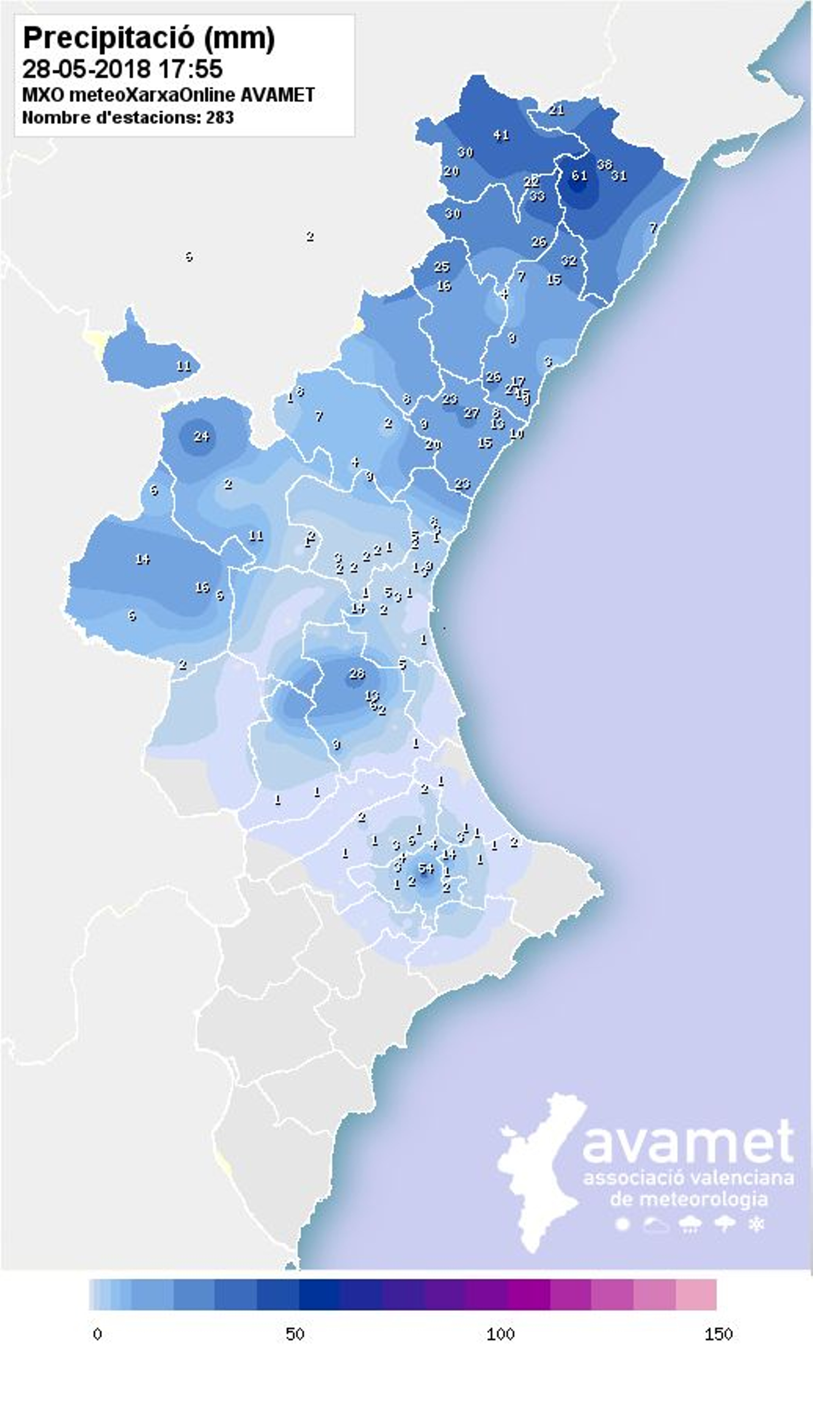 Amb el mes de maig s'acaba la primavera meteorològica, i sembla que es vol acomiadar amb molta activitat tempestuosa. De fet, ahir diumenge van ser notícia les tronades que afectaren sobretot les comarques centrals, que van deixar 75 l/m² a La Torre (Utiel), 47 l/m² al nucli d'Utiel, 43 a Xalans, 32 dels quals van caure en només una hora, i 38 l/m² a Énguera. Les pluges van arribar al litoral i, com sol passar en aquestes situacions, la irregularitat va ser molt palesa. A tall d'exemple, a la ciutat de València van caure 18,7 l/m² a la Universitat Politècnica, mentre que a Vivers recolliren 8,6 l/m² i al Botànic, només 5 l/m².