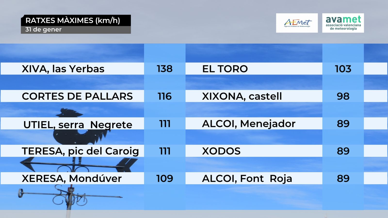 A vegades, en funció de com s'apropa el front, el vent canvia lleugerament de direcció i bufa aponentat, de l'oest, un vent que afecta especialment les comarques centrals. I aquest dijous dia 31 de gener hem tingut una autèntica ponentada, amb ratxes que han superat els 100 km/h en zones elevades i que a ciutats com València ha arribat als 62 km/h.